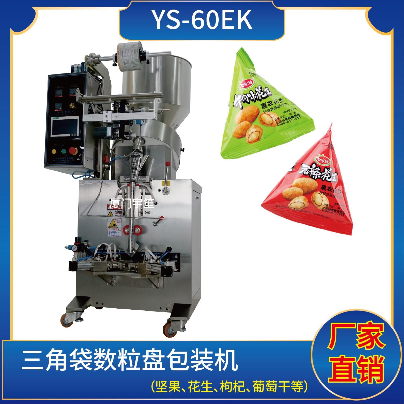 YP-60EK 三角袋包裝機特點1、適用于食品、醫(yī)藥、化工、化妝品行業(yè)中顆粒物品的計量包裝。2、可自動完成制袋、計量、下料、封合、分切、計數(shù)、且可根據(jù)客戶要求配置打印批號等功能。3、觸摸屏操作,PLC 控制,驅動步進電機控制袋長,性能穩(wěn)定、調整方便、檢測準確。智能式溫控儀,PID調節(jié),保證將溫度的誤差范圍控制在1℃以…
